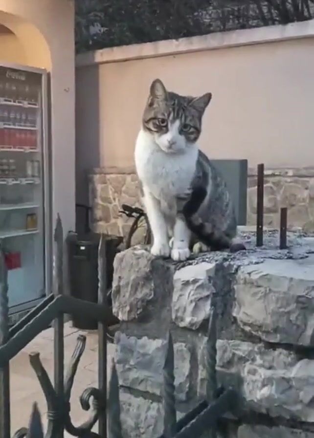 gray and white cat sitting on top of a stone column next to a black wrought-iron fence. Behind the column is a beige wall with a stone base. A bicycle is visible behind the fence. A red Coca-Cola vending machine stands against the wall of a building with a red awning, and a light fixture is visible above it. The sky is overcast and trees are visible in the background. The cat looks directly at the camera with a slightly grumpy expression.