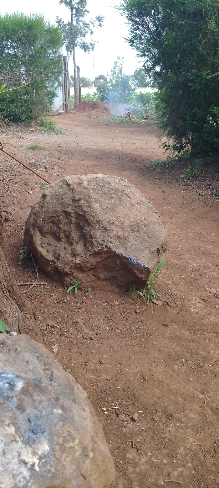 This image depicts an unpaved outdoor environment, identified as being in Ngong ward, Kenya. The foreground is dominated by a large, irregularly shaped, light brown boulder situated centrally on a reddish-brown dirt path. Small green sprouts emerge from the ground around the boulder's base. In the extreme lower-left corner, a portion of another rock or tree trunk is visible. A rusty metal rod lies partially visible on the ground to the left of the prominent boulder. The dirt path extends into the midground, curving gently toward the right. On the left side of the path, green bushes partially obscure a corrugated metal structure and two weathered wooden posts, suggesting a gate or fence line. Further into the midground, on the right side of the path, a small, controlled burn is indicated by a plume of white smoke rising from a pile of debris, which includes some twisted metal objects. The background features dense green foliage and trees on both sides of the path, with a bright, overcast sky visible above. No individuals are present.