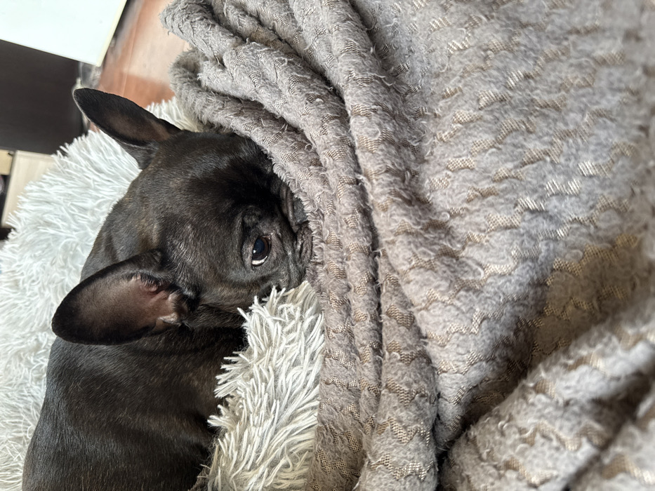A black French Bulldog is depicted resting indoors, positioned on a fluffy grey pet bed