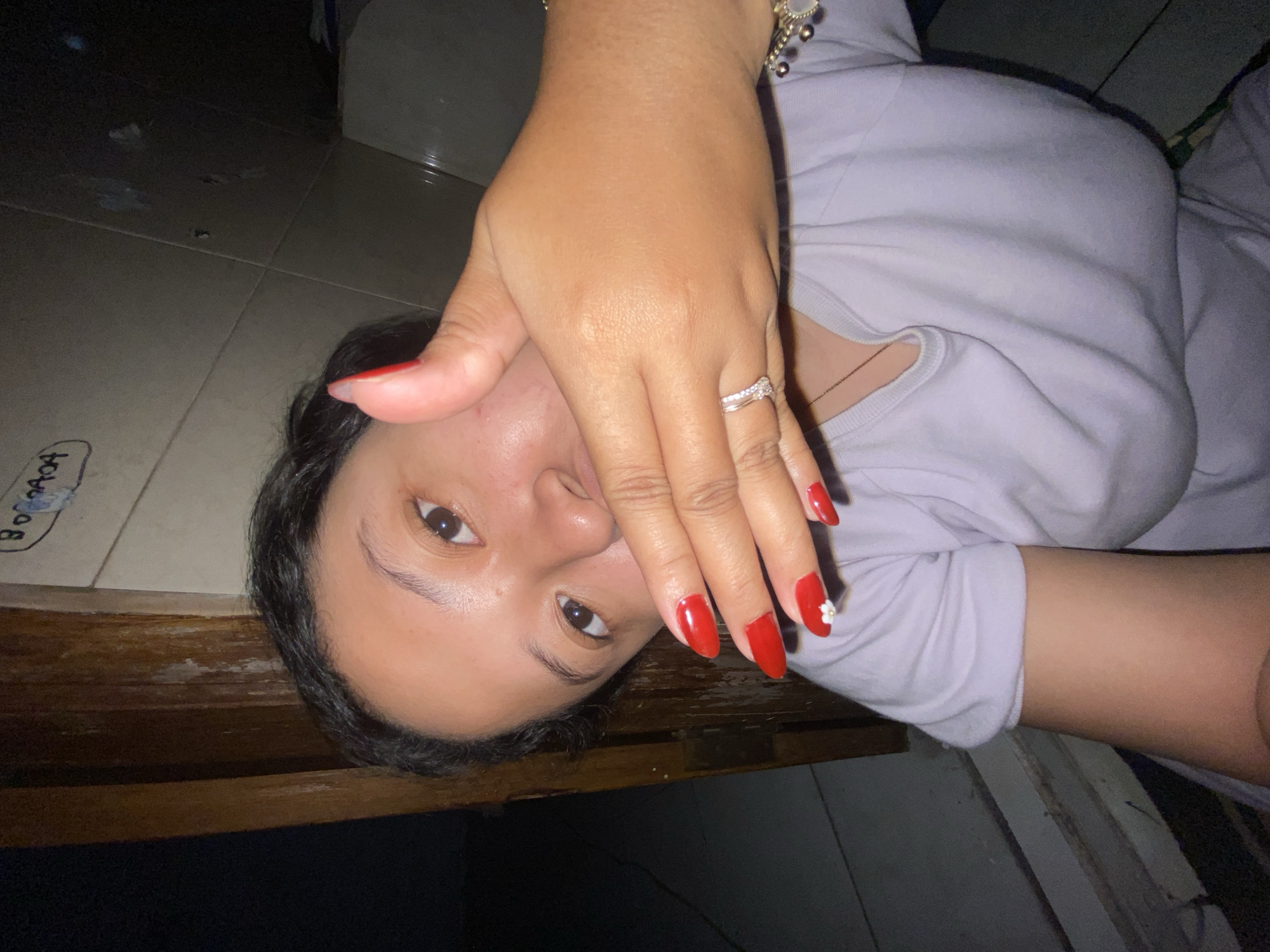A person lies at an angle to the viewer, partially obscuring their face with their hand. The person has medium-length dark hair. The fingers on the hand are adorned with red nail polish. A silver-colored ring is on the ring finger. The person appears to be wearing a pale top. The background shows a floor and wall. Writing, apparently "AOA", is present on one wall. The image was taken at an angle. There is a dark section below the person. The picture was taken in the city of Gelam, Indonesia.