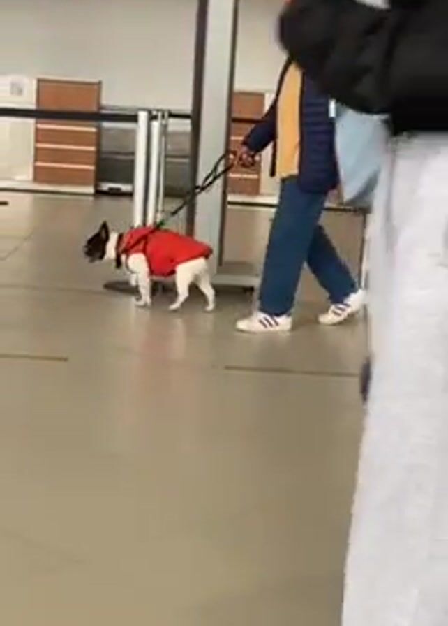 man walking through an airport terminal with a small dog on a leash. The man is wearing a blue jacket, light yellow shirt, blue pants, and white sneakers with blue stripes. The dog, which appears to be a French bulldog, is wearing a red coat. The terminal floor is light-colored tile, and several people are walking through the terminal. Airport check-in desks and security barriers are visible in the background.
