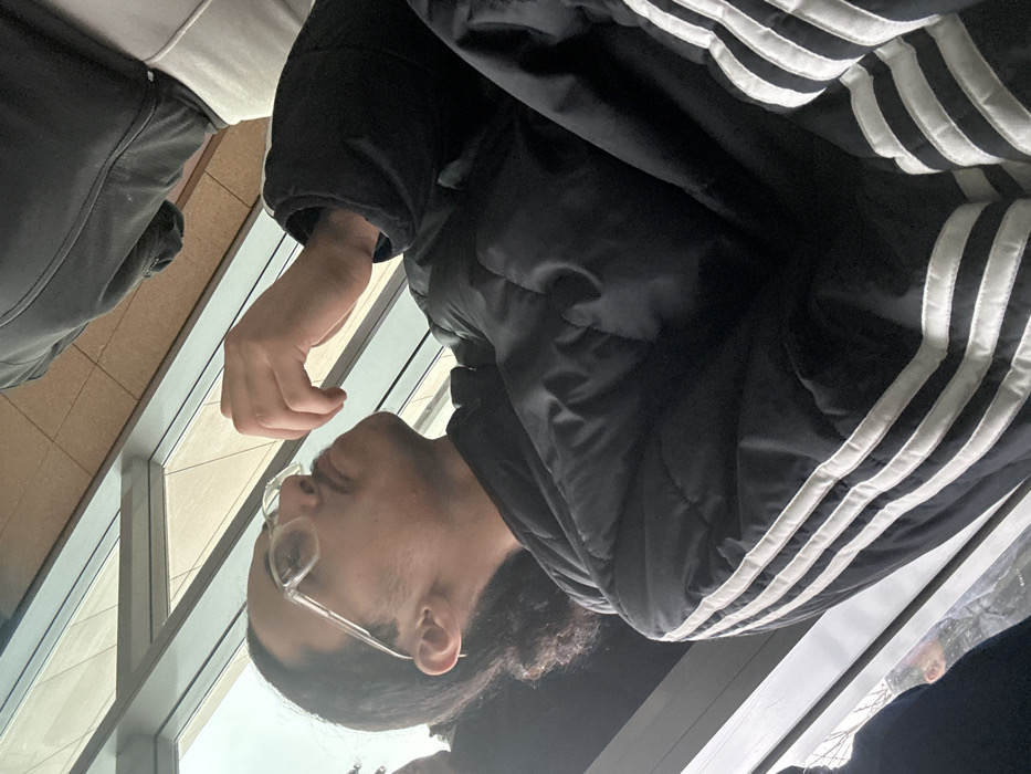 An adult male is prominently featured indoors in Strasbourg, France, captured from a low, angled perspective. He possesses dark hair pulled back into a bun or ponytail, a mustache, and wears clear-framed eyeglasses. A silver hoop earring is visible in his left ear. His attire consists of a black puffer jacket featuring three white stripes along the sleeves. His right hand is raised with fingers curled, positioned near his face, as he gazes upwards and to the right. Portions of two additional individuals are observable: a head to the far left and a torso clad in a dark top and light-colored pants in the upper right background. The environment is characterized by large, multi-paneled glass windows with metallic frames, indicative of modern architecture. A light brown, textured surface, likely a ceiling or upper wall, is visible above the windows.