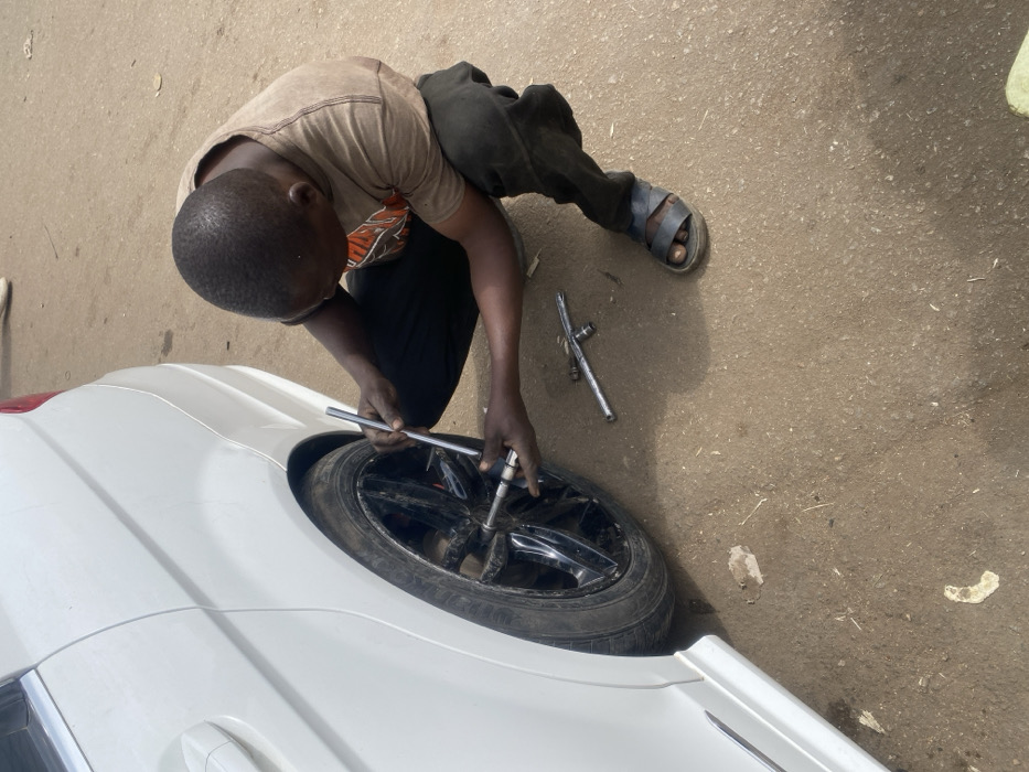 The image depicts an outdoor scene in an unpaved, dusty area in Jos, Nigeria, likely a roadside or informal service bay