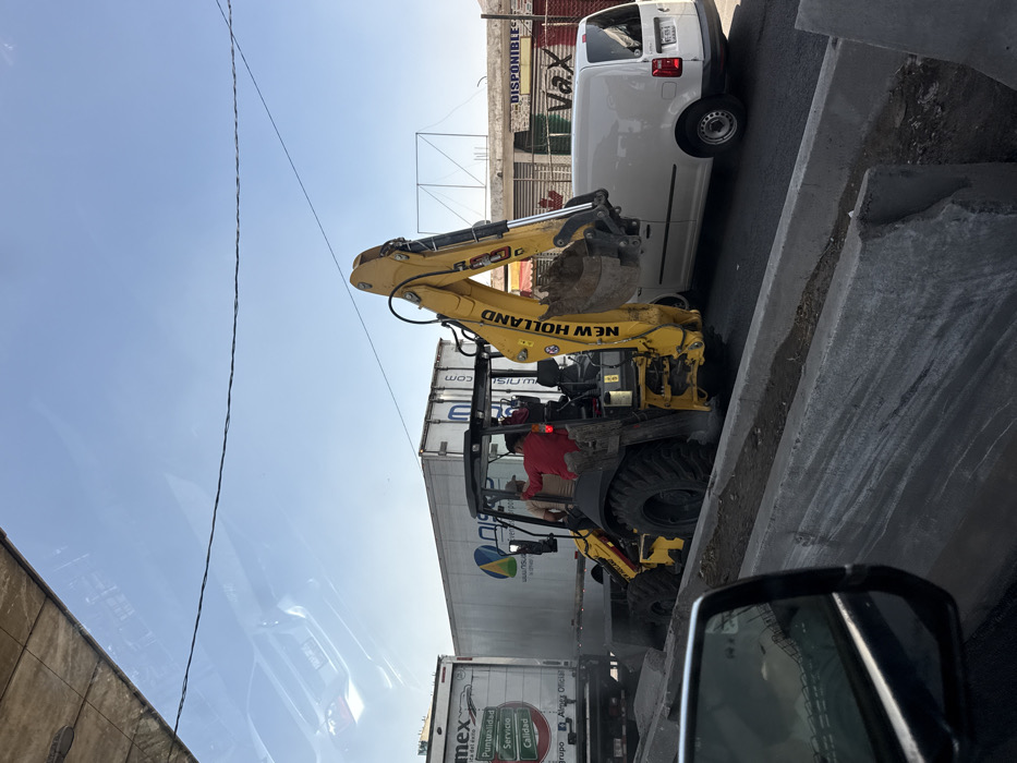 The image depicts a daytime urban scene from the perspective of a vehicle, likely in traffic, on a road in Tlalnepantla, Mexico. In the mid-ground, a yellow and black New Holland backhoe loader is prominent, its rear excavator arm raised with the bucket containing dirt or debris. Two individuals are visible within the backhoe's cab; one wears a red shirt, appearing to be the operator. To the backhoe's left, two white box trucks are queued. The front truck displays "Aimex Official" branding. To the backhoe's right, a white panel van, possibly a Volkswagen Caddy, is positioned in an adjacent lane. In the foreground, a dark vehicle interior is visible, with a side mirror reflecting a part of the road and a concrete structure. Concrete barriers or dividers line the road in the immediate foreground, with soil visible in the trench between them, suggesting road construction or modification. Overhead, against a clear blue sky, utility wires span horizontally. Reflections of an overhead structure and the vehicle's interior are present on the glass from which the photo was taken. The background features various urban elements: a large metal billboard frame, commercial buildings, and signs. One partially legible sign reads "DISPONIBLE" and "VaX," with a red maple leaf symbol also visible. The overall environment suggests an active commercial and industrial area with ongoing road work or traffic congestion under bright, natural light.