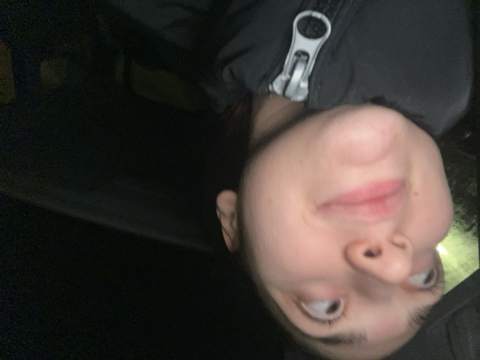 A face dominates the view, angled upside down and positioned on the right. The person has fair skin, light eyebrows, and pink lips. Their eyes, looking upward, have dark lashes. A jacket with a visible silver zipper is partially visible above their head. The background features a shadowy area to the left and a slightly brighter area near the face on the right. The overall image has low light and soft focus.