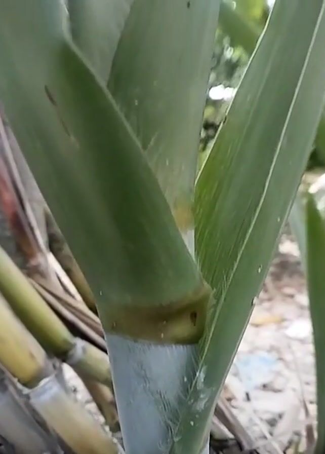close-up of a sugarcane plant. The stalk is light green and segmented, with long, slender leaves branching out from the nodes. The leaves are a darker green with lighter colored veins running through them. The background is blurred, showing hints of other plants and trees. The focus is primarily on the stalk and leaves of the sugarcane.