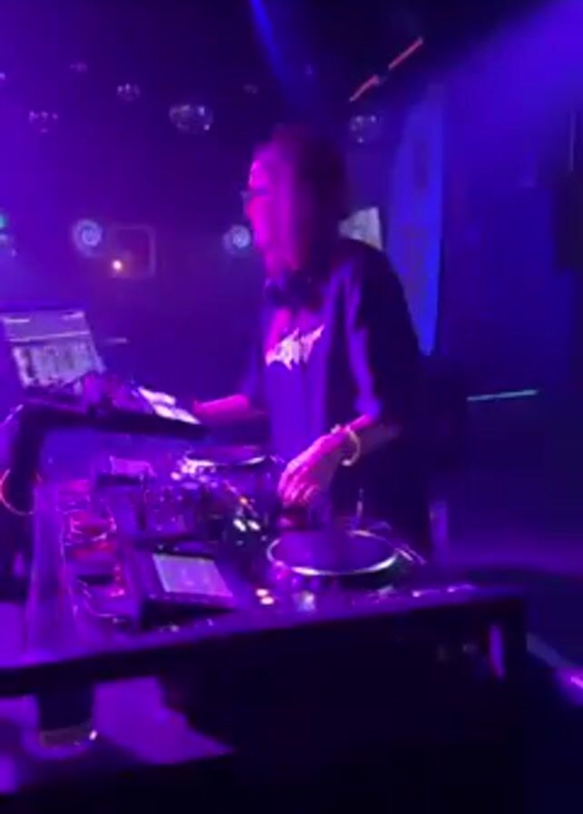 A DJ stands behind a console in a nightclub setting