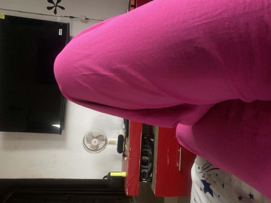This image depicts an indoor scene in Odo Ona, Nigeria. In the foreground, a person's lower body and partially obscured torso are covered by bright pink fabric. To the bottom left, a white bedsheet with a blue star pattern is visible. The background features a white wall with visible markings and discolorations. A black flat-screen television is mounted centrally on this wall. Below the television, a two-tiered red cabinet or media stand is present. The top tier of the red stand holds a white desk fan, a yellow flashlight, and a small black electronic device. Positioned between the two tiers of the red stand is a black soundbar or speaker system. A dark wooden door is partially visible on the far left. A black, starburst-shaped decorative element is affixed to the wall to the right of the television.