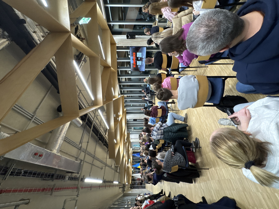 An indoor, angled shot depicts a gathering of people seated in rows of chairs. A large wooden structure with rectangular openings spans the ceiling. A screen displays text above the audience. Attendees are diverse in appearance, and their clothing varies in color and style. A Ukrainian flag is visible toward the back of the room. The scene conveys a sense of a conference or lecture setting.