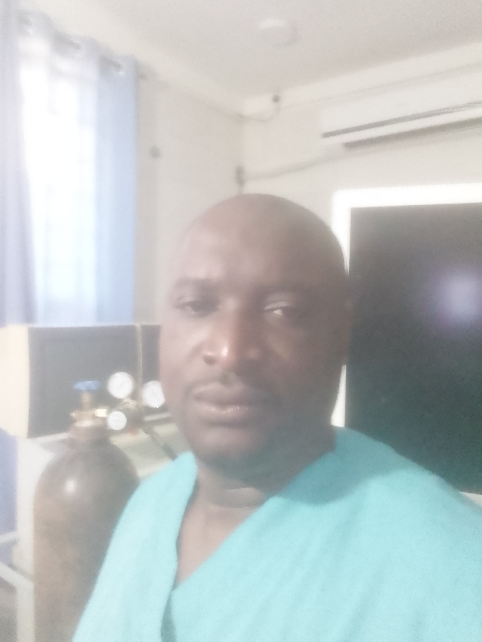 The image displays a bald adult male, appearing of African descent, wearing a teal medical scrub top, positioned centrally and looking directly into the camera