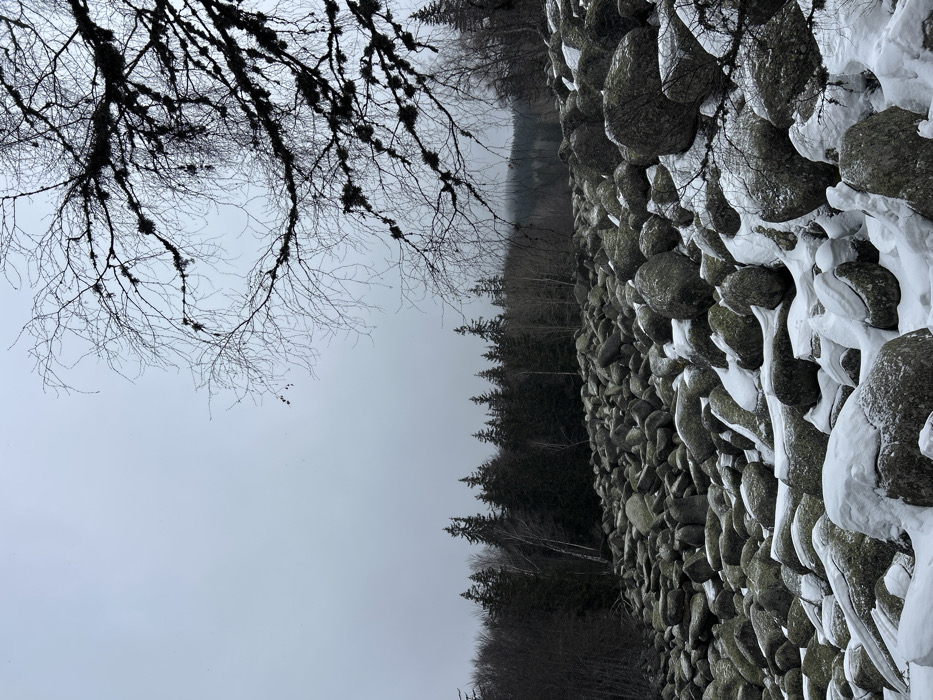 The image presents a winter landscape at Zlatnite Mostove (Golden Bridges) on Vitosha Mountain, located near Sofia, Bulgaria. The foreground and midground feature an extensive "stone river" formation composed of numerous grey, rounded boulders, partially covered by uneven white snowdrifts. The snow highlights the contours of the rocks. In the background, a dense line of dark coniferous trees forms a horizon, interspersed with the bare trunks and branches of a few deciduous trees. Further beyond, a forested mountain slope is visible, partially obscured by atmospheric haze. The upper right portion of the frame is occupied by the dark, intricate, bare branches of a deciduous tree, heavily coated with lichen or moss. The sky is uniformly overcast and grey. No people, animals, or man-made structures are present within the scene. The lighting is diffused and even, consistent with a cloudy winter day.