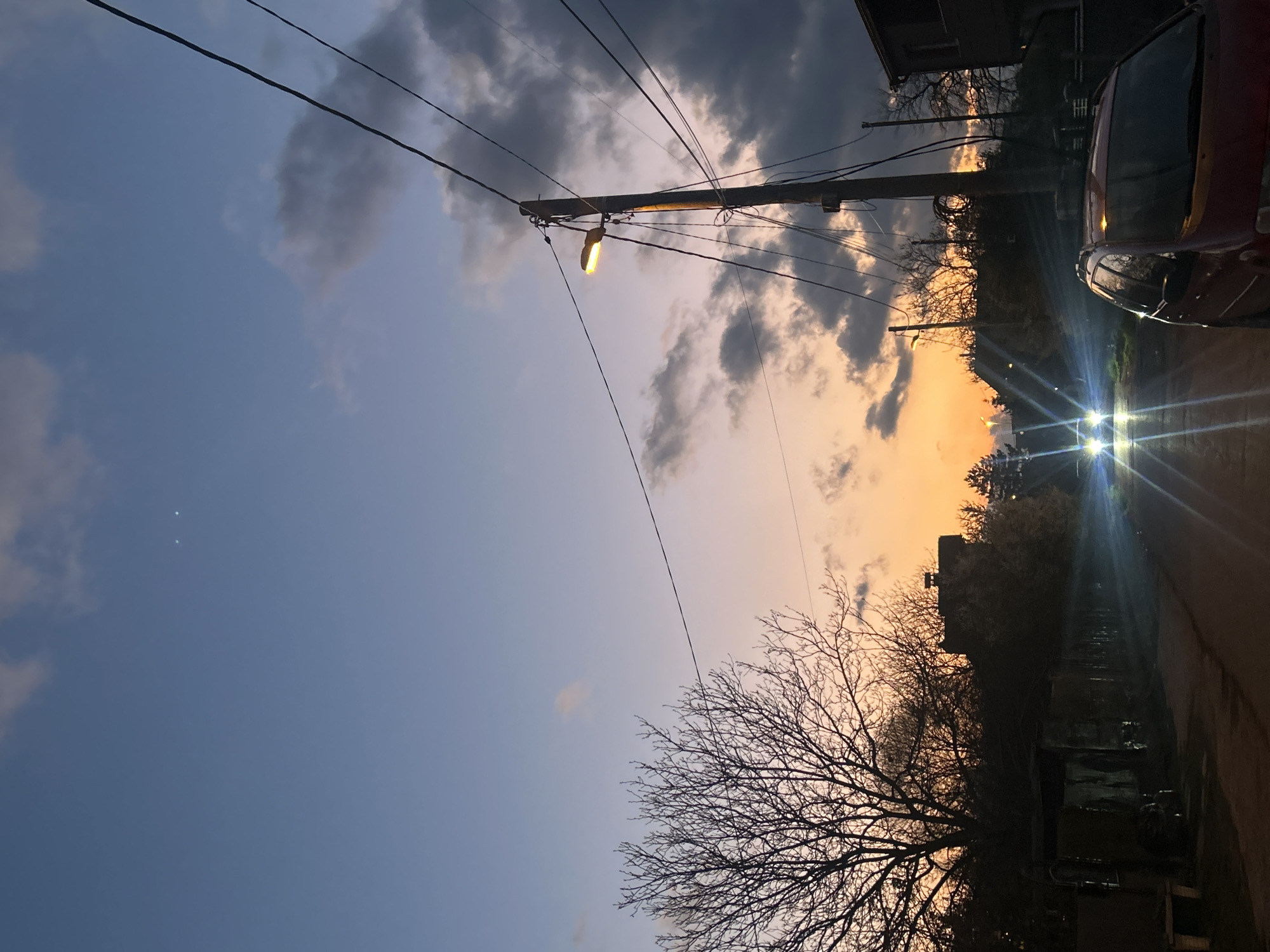 The image depicts a twilight urban scene. A street light on a wooden pole illuminates the immediate area. A red car is partially visible on the right side of the frame, with its headlights shining brightly down the road. Above the car and street light, the sky transitions from dark clouds to a vibrant orange sunset. A bare tree branch is visible against the sky in the lower right corner. Electrical wires crisscross the upper portion of the image. The location is a street in an urban area, but the exact city is unknown.