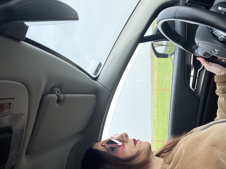 The scene is set inside a vehicle in Olingen, Luxembourg, viewed from the front passenger area towards the driver. An adult individual, identified by dark hair, wearing large pink-framed sunglasses, and red lipstick, occupies the driver's seat. They are dressed in a light brown zippered jacket, with their right hand positioned on the lower rim of a black steering wheel bearing the "KIA" logo. The car's interior features a gray headliner and a raised sun visor. Beyond the driver's side window, an open green field, demarcated by a fence line with wooden posts, extends to the horizon under an overcast sky. A faint line of distant trees is visible beyond the field.
