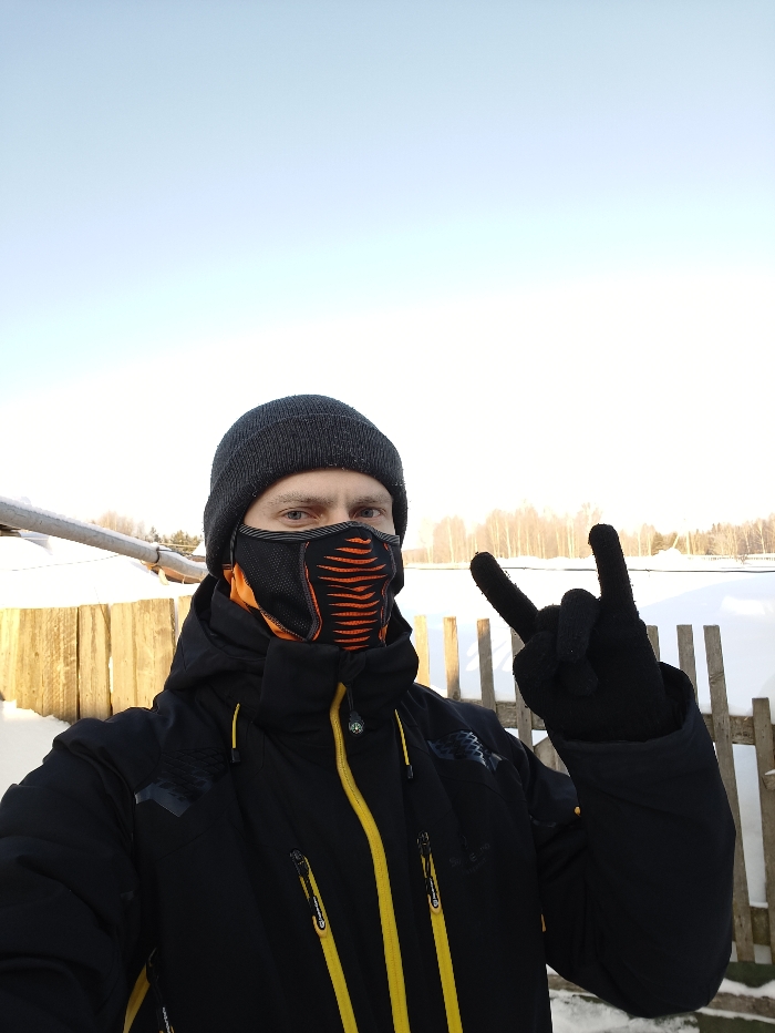 An individual is depicted outdoors in Nizhnyaya Gar', Russia, during daylight hours in a winter setting