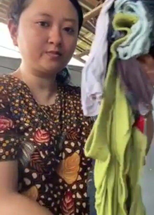 A woman is standing outside and holding a pile of folded laundry. She has dark hair pulled back, and is wearing a dark, patterned shirt. She lifts the laundry higher to look through the pile. Behind her is a wall, a metal roof, and other objects out of focus.