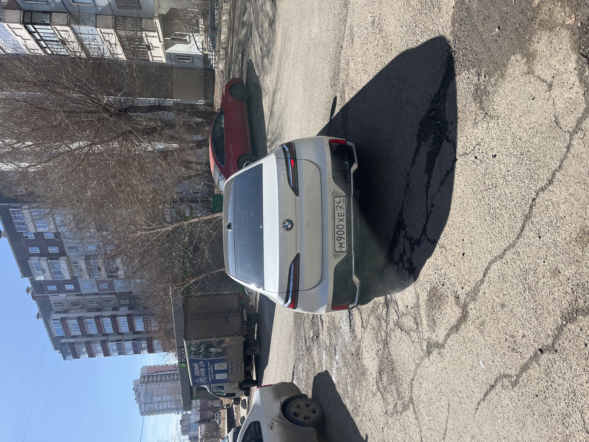 The image depicts a street scene, with a white BMW SUV parked in the foreground. The license plate reads "M900 XE 24," indicating it is registered in Krasnoyarsk, Russia. A red car is parked near the SUV. In the background, there are residential buildings, a truck with an advertisement, and bare trees. The ground is asphalt with cracks and shadows. The overall environment suggests an urban setting on a sunny day.