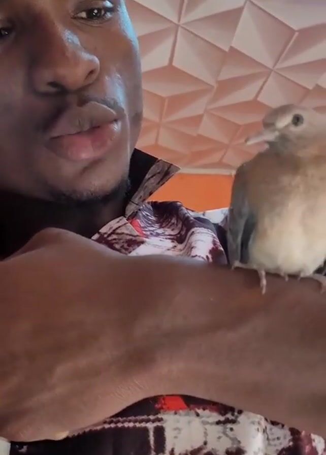 A man is holding a small, light brown bird on his forearm. He's wearing a patterned shirt and a beanie. He looks at the camera and speaks to the bird, saying "Good morning, baby." The camera focuses on the bird, showing its small feet gripping the man's arm. The background features a wall with a geometric pattern and an orange-painted section. The lighting in the room seems bright and natural.