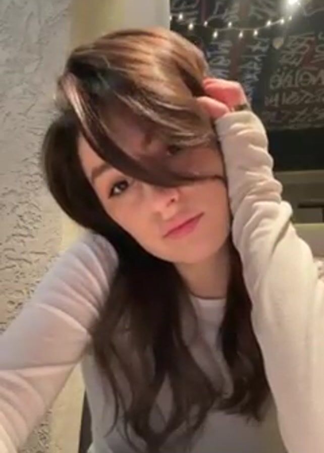 A young woman is indoors, seated at a table. She has shoulder-length brunette hair with bangs. She is wearing a long-sleeved light-colored shirt. She looks at the camera, at times pushing her hair back from her face. There is background noise, including indistinct voices. Behind her is a painted wall and string lights.