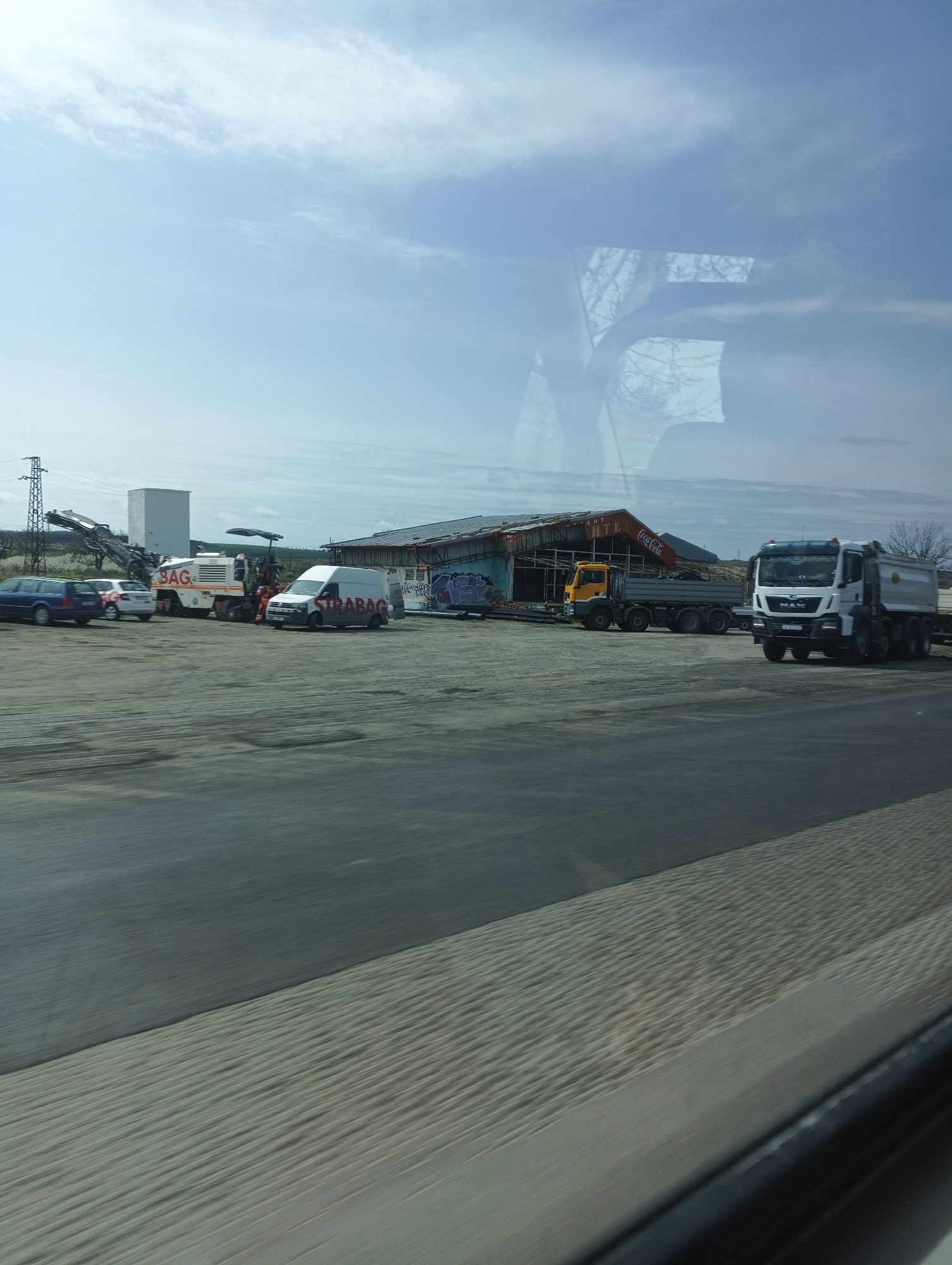 view from a moving vehicle, likely a car or bus, towards a construction site in Sokolovo, Bulgaria