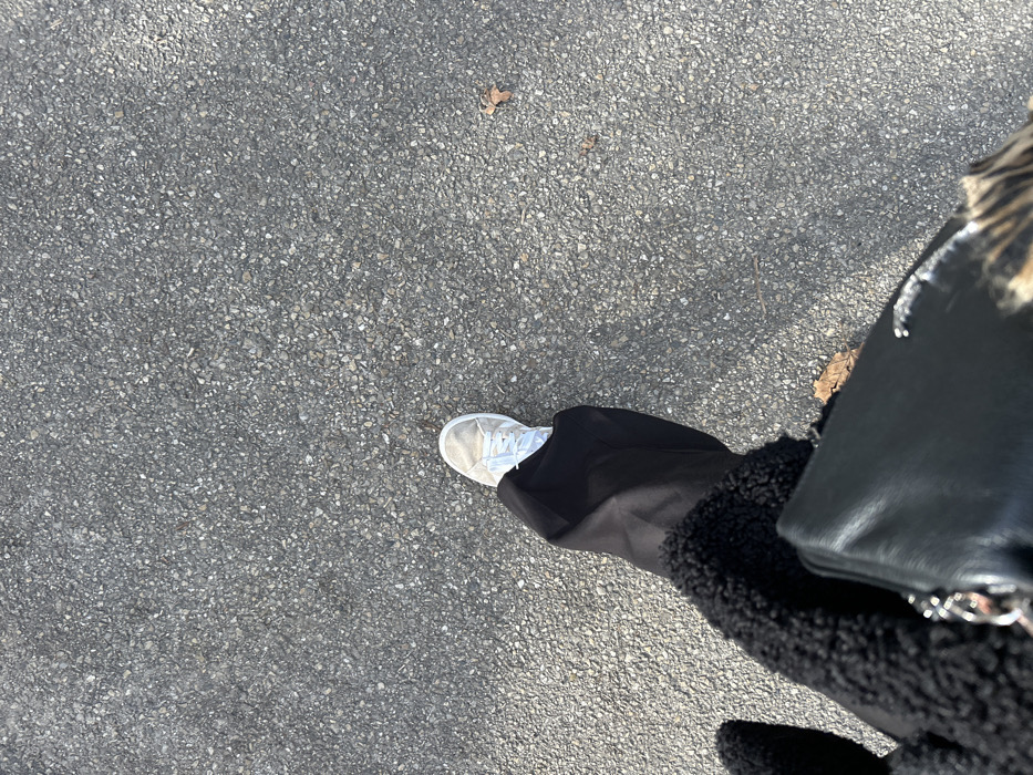 An overhead view depicts a single individual's lower body on a coarse-grained asphalt surface in Saint-Étienne, France. The person wears a light-colored, lace-up sneaker on their visible foot, black wide-leg trousers, and a black textured coat or jacket on the left side. A black shoulder bag with a silver-colored chain strap is carried on the left, partially obscuring an arm and revealing a glimpse of patterned fabric, possibly animal print, beneath. The ground is composed of grey asphalt with embedded small stones, featuring a few scattered dry brown leaves. The scene is illuminated by strong natural sunlight, casting subtle shadows.
