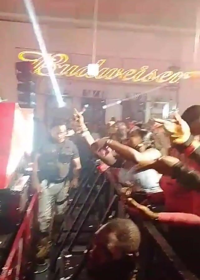The video depicts a lively concert or party scene. A crowd of people is visible, many of whom appear to be dancing and enjoying the music. There are security guards present, who appear to be monitoring the crowd. A large Budweiser sign can be seen in the background, indicating the sponsor or location of the event. The scene is illuminated with bright lights and possibly some fog or haze, which contributes to the energetic atmosphere.