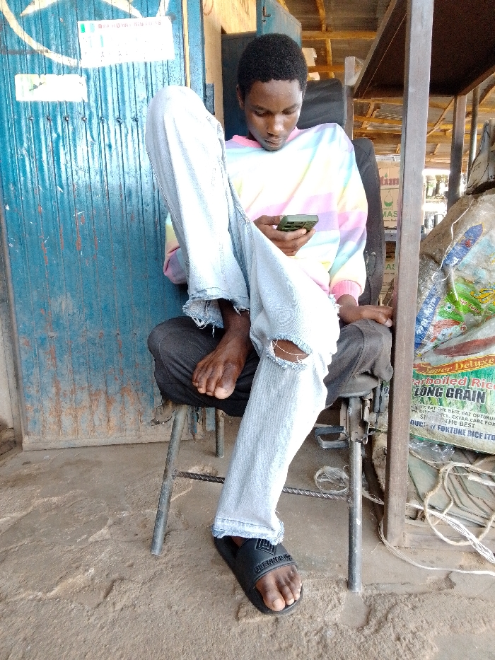 A young male is seated on a black-seated, metal-framed chair, holding a dark-colored smartphone with both hands, his gaze directed at the screen. He wears a pastel rainbow-striped long-sleeved top and light blue ripped denim jeans, exhibiting a tear on the right knee and frayed hems. His left foot is bare and rests elevated on his right thigh. His right foot, partially visible, is clad in a black slide sandal bearing the "BALENCIAGA" brand. The setting is an outdoor or semi-outdoor commercial area, consistent with a market stall in a city like Jos, Nigeria. To the subject's left is a faded blue corrugated metal door or shutter with multiple white papers affixed. To his right, a metal framework supports a large, partially torn sack of "SUPER DELUXE PARBOILED RICE LONG GRAIN" from "FORTUNE RICE LTD.", indicating a retail or storage function. The ground is an uneven, light-colored concrete or packed earth surface.