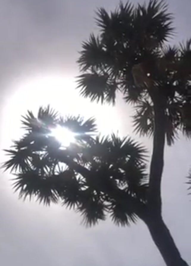 palm trees silhouetted against a bright sun in a light sky