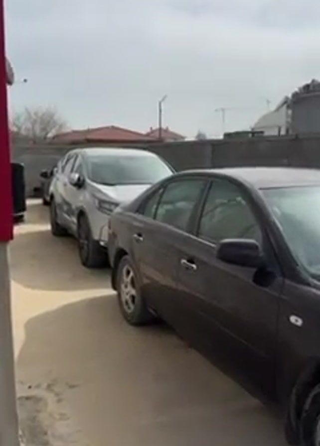 series of cars parked in a lot. The first shot shows a silver SUV parked behind a dark burgundy sedan. The camera pans around the sedan. The next shot shows a gray Audi station wagon parked next to a building.