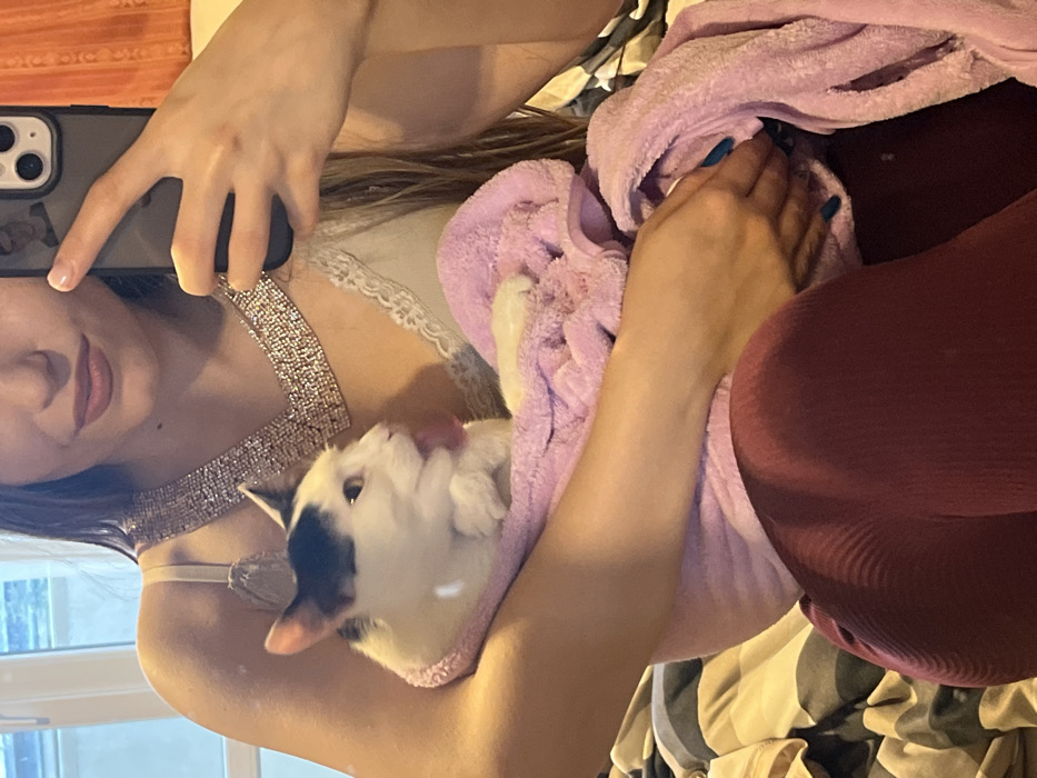 - "An indoor scene depicts a female individual holding a domestic cat, which is wrapped in a pink towel" by FM-9pc972, licensed under CC BY 4.0