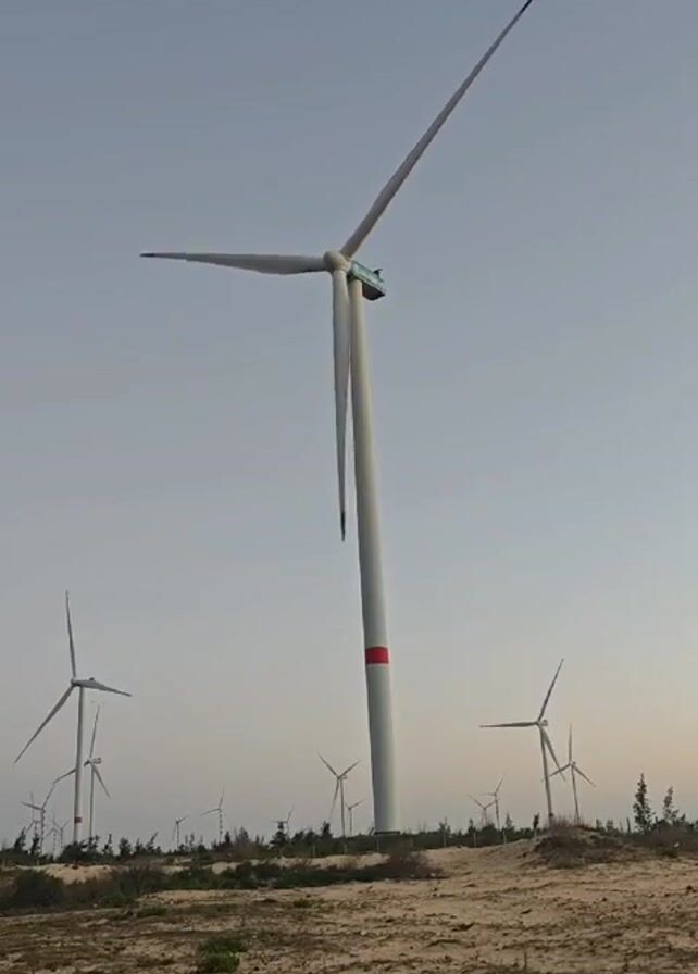 wind farm with multiple wind turbines standing on a sandy, barren landscape under a clear, pale sky. The turbines are white with three blades, some with red tips, and a red band near the base of one of the towers. The turbines are spaced apart, with some small, sparse vegetation visible on the ground. The foreground is sandy soil. The turbines are not moving significantly.