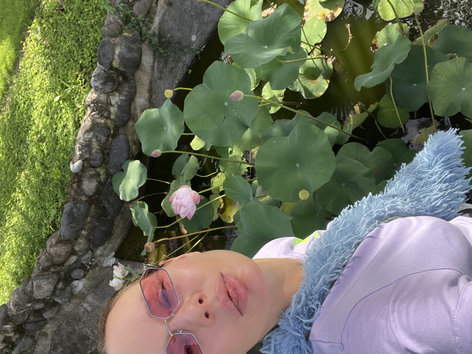 An outdoor scene in Jimbaran, Indonesia, depicts a female subject in the left foreground, facing slightly right and angled towards the viewer. She wears silver-framed, pink-tinted octagonal sunglasses, a light purple hooded top, and a light blue fluffy scarf draped over her left shoulder. Her lips are visible and appear glossy. To her right and occupying the majority of the frame is a pond with dark green water, populated by numerous large, circular green lotus leaves, one prominent open pink lotus flower, multiple pink lotus buds in various stages of development, and several yellowish-green lotus seed pods. The pond's edge is defined by a low, dark grey stone wall, behind which a dense patch of bright green ground cover is visible under direct sunlight.