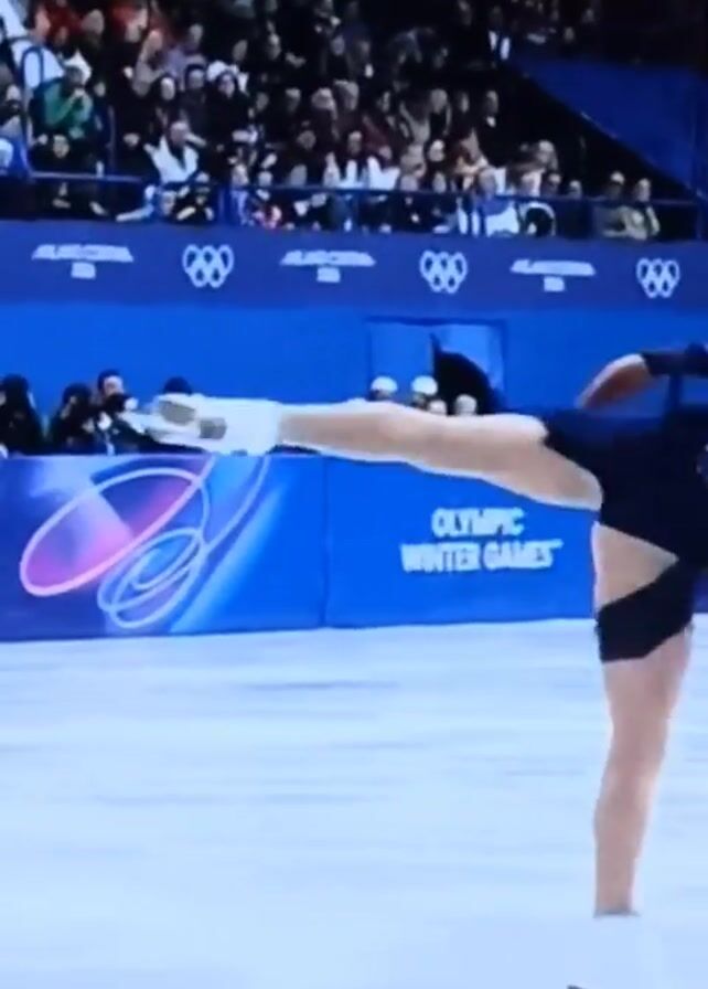 A female figure skater wearing a dark blue, sparkling, high-cut costume is performing a spin on an ice rink. She is positioned in a modified Biellmann spin, with her leg extended backward at a high angle. The skater has blonde hair and is wearing white ice skates. The background shows a blue barrier with the Olympic rings and the words "OLYMPIC WINTER GAMES." A crowd of spectators is visible in the blurred background behind the barrier. The ice rink surface is clean and white. The camera is stationary, capturing the skater's rotation from a medium distance.