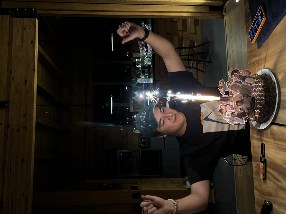 A young man is celebrating his birthday. He is facing right with a sparkler held horizontally near his head. He wears a black t-shirt with a white and orange Nike logo and a dark baseball cap. A chocolate cake decorated with photos of people sits on a wooden table. Behind him is a dimly lit room with wooden walls and furniture. A phone rests on the table near the cake, and a lighter is also visible.