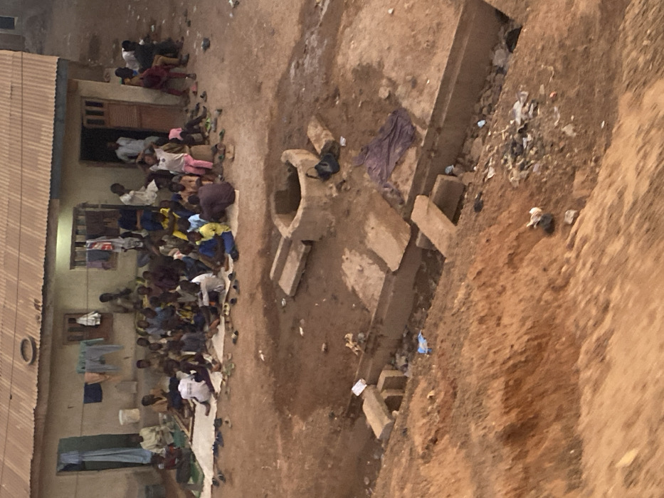 An outdoor gathering centers around a concrete structure resembling a well, near a low building. The building has a corrugated metal roof and laundry hanging outside windows. A large group of people, primarily men, are seated on mats, forming a gathering of over thirty individuals. The area appears to be a courtyard or open space adjacent to the building, with a dirt surface. Discarded objects and debris litter the ground, creating a sense of neglect.