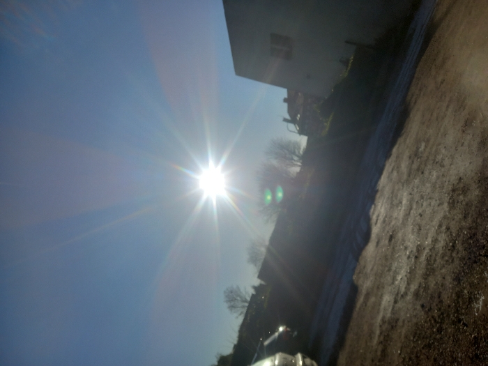 The image captures an outdoor scene in Noyelles-sous-Lens, France, dominated by a clear blue sky. The sun is prominently positioned near the center of the frame, emitting strong light with a distinct starburst effect and significant lens flare. The foreground consists of an unpaved surface, likely dirt or gravel, with visible patches of white material consistent with frost or ice, indicating cold temperatures. On the far left, the partial front section of a light-colored vehicle, possibly a car, is visible, with a darker vehicle partially obscured behind it. The mid-ground features an upward-sloping terrain with leafless trees and sparse vegetation, largely silhouetted by the intense backlighting. On the right side, a portion of a light-colored, two-story building with at least one visible window is present. The strong illumination from the sun creates deep shadows and produces two distinct green lens flares in the lower mid-ground. No individuals are visible in the scene.