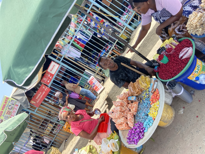 This image depicts an active outdoor market scene in Dar es-Salaam, Tanzania. The scene is illuminated by bright daylight, casting defined shadows. In the foreground-left, a woman wearing a pink short-sleeved top and a multi-colored patterned headwrap is positioned behind a market stall covered by a green umbrella. She looks directly towards the camera, holding a small clear plastic bottle. On her stall, clear plastic containers hold yellow-orange substances, likely beverages. A partially obscured sign to her left reads "JUS MIKATE". To the right, a seated male vendor in a dark t-shirt attends to his goods. An oval-shaped tray in front of him displays an assortment of individually wrapped colorful candies and snacks, including bags of light-colored items, possibly nuts or biscuits. Beside this tray, a large blue "Safi" branded bucket is filled to the brim with numerous small, bright red, spherical items, some of which are scattered on the dirt ground. The man holds two slender wooden sticks. Adjacent to the male vendor, a female customer wearing a light pink top and a patterned skirt leans over the stall, her right hand pointing towards the red items in the blue bucket, indicating an interaction or transaction. The background features a blue metal fence or grille, behind which clothes and other merchandise are displayed for sale. Multiple "WAKALA" signs, indicating mobile money or airtime agent services for Vodacom and Tigo, are visible attached to this fence. Several other individuals are present in the background, moving or standing amidst further market stalls. The ground throughout the visible market area appears to be unpaved earth or compacted dirt.