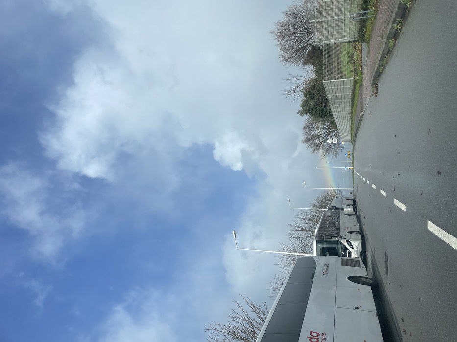 The image captures an outdoor scene along a wet asphalt road in Vila Real, Portugal, under a sky exhibiting both clear blue patches with sparse white clouds and denser grey-white cloud cover. A vibrant rainbow arcs across the distant horizon, visible through the clouds. On the left side of the road, three white passenger coaches are parked sequentially, facing away from the camera. The closest bus displays a red logo and the word "Amarante" on its side. A series of tall, white streetlights are positioned along the left. On the right, the road is bordered by a sidewalk, a grey concrete retaining wall, and a wire mesh fence. Beyond the fence, bare deciduous trees and some evergreen vegetation are present. Further along the road on the right, a circular speed limit sign indicating "60" and other road signage are visible near what appears to be an intersection or roundabout. The road surface and sidewalk show scattered dry leaves. No individuals are visible within the frame.