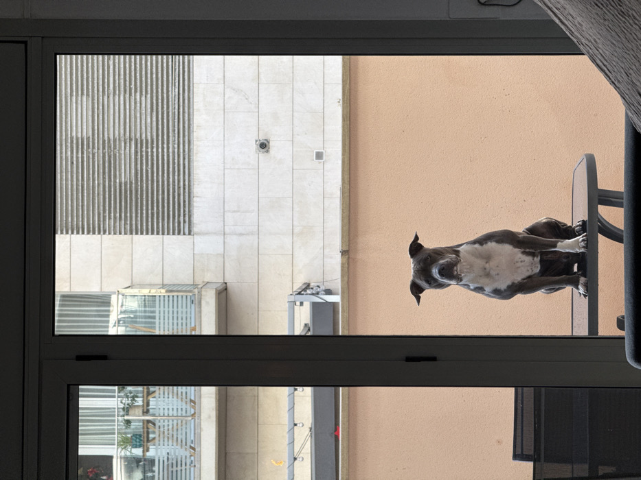 The image depicts a gray and white American Staffordshire Terrier, or similar breed, seated centrally on a dark glass-top outdoor table. The dog faces directly towards the viewer, looking through a dark-framed glass door or window. Its body is dark gray/brindle with a prominent white chest and muzzle. The immediate background behind the dog and table is a plain, light peach-colored exterior wall, indicating an outdoor terrace or patio. To the left, a dark outdoor chair is partially visible behind the door frame. Above the peach wall, a multi-story building facade is visible. This facade is constructed of light beige or off-white rectangular panels. On the upper left, a balcony is present with a clear glass railing featuring horizontal light-colored bars. A light-colored wooden table with potted plants sits on this balcony. To the right, on the main building facade, is a large rectangular section composed of horizontal louvers or slats. Below this louvered section, a small, dark circular object, consistent with a security camera, is mounted on the beige wall. Lower structures or railings are partially visible below the main building facade. The overall scene is an urban setting, observed from an interior space, likely in the city of Badalona, Spain. A dark, possibly upholstered, object is visible in the bottom right foreground, suggesting the vantage point is from inside a room.