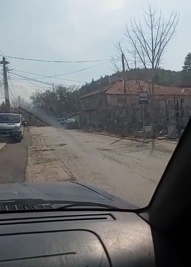 The view from inside a parked car shows a partially overcast sky over a rural street. Several vehicles are parked along the street. A building with a red tile roof sits behind a low stone wall. Bare tree branches reach upward to the sky. Power lines run along the roadside.