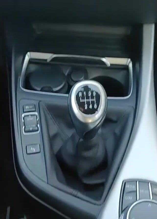 interior of a car, focusing on the dashboard and center console. The car has a manual transmission with a six-speed gear shift. There are buttons for sport and eco pro modes, as well as parking assist. The infotainment system displays music information and navigation. The climate control settings are visible, with the temperature set to 19.5 degrees Celsius. The video then shifts to show the view from the driver's seat, looking out onto a street with houses and a white van parked in the distance. The speedometer and other gauges are visible.