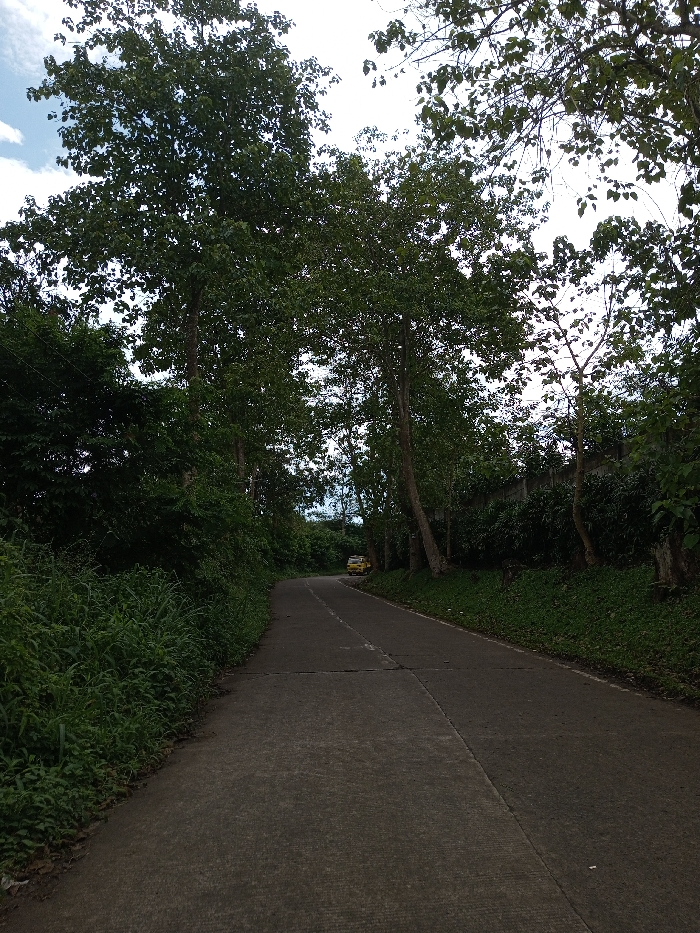 The image displays a paved thoroughfare in Ariyalai, Sri Lanka, extending into the distance with a gentle curve to the left. The road surface appears to be concrete, segmented, and exhibits minor wear. On the left side, dense, untended green vegetation, including tall grasses and shrubs, borders the road. On the right, a row of mature trees with substantial trunks and full, green canopies line the path, with additional dense foliage and a visible wall or fence further behind. The trees create a partial overhead canopy, allowing glimpses of a cloudy sky above. A light-colored, possibly yellow, compact vehicle or auto-rickshaw is visible in the distance, positioned on the right side of the road as it begins to curve. No individuals are present in the scene. The overall environment suggests a rural or semi-rural setting under daylight conditions.