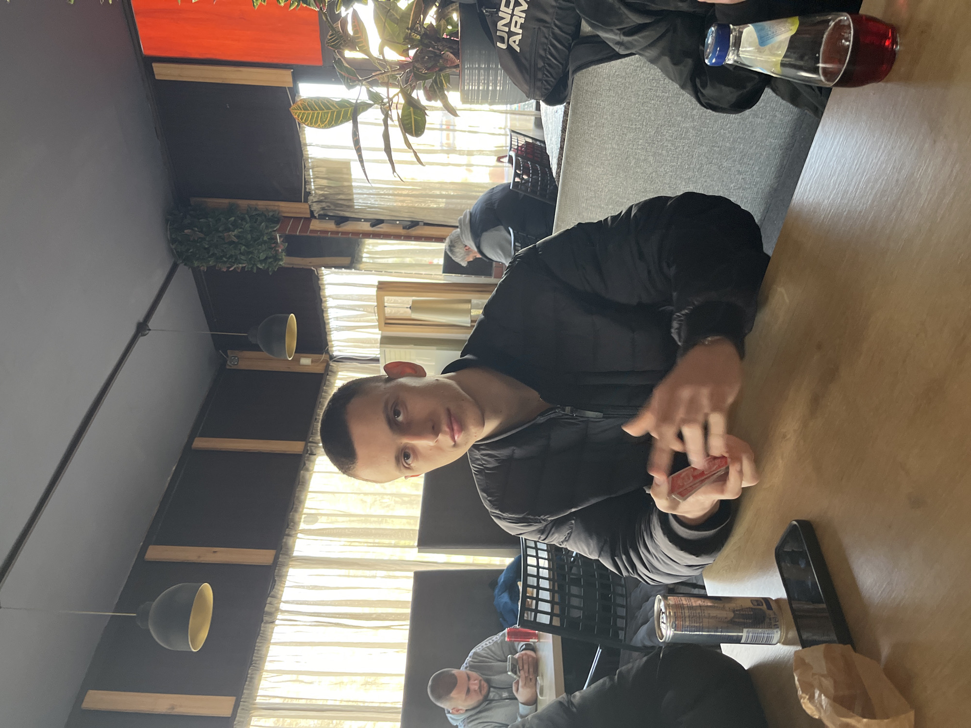 interior of a casual dining establishment, likely a cafe or restaurant, situated in Sofia, Bulgaria. The primary subject is a young adult male with short dark hair, wearing a black puffer jacket, seated at a light brown wooden table, looking directly at the camera. He is holding a deck of red-backed playing cards in his hands, which are blurred from motion. On the table in front of him are a silver Red Bull energy drink can, a black smartphone lying flat, and a crumpled light brown paper bag. To the right, partially visible, is another individual's arm in a black jacket, with a clear bottle containing a red liquid and a blue cap placed near them on the table. In the mid-ground, a second young adult male with short dark hair, wearing a grey hooded sweatshirt, is seated at a separate wooden table, focused on a smartphone. A red cup is also on his table. In the background to the right, an older male with grey hair, wearing a grey vest, is seated facing away from the camera. A black "UNDER ARMOUR" bag is visible on a grey upholstered bench seat behind him. The establishment features a dark grey ceiling with exposed light-colored wooden strips and multiple black pendant light fixtures with golden interiors. Large windows along the back wall are covered by sheer, light-colored curtains, allowing natural daylight into the space. Interior decor includes various potted plants, a large bright orange rectangular panel on the right wall, and upholstered grey bench seating paired with black chairs.