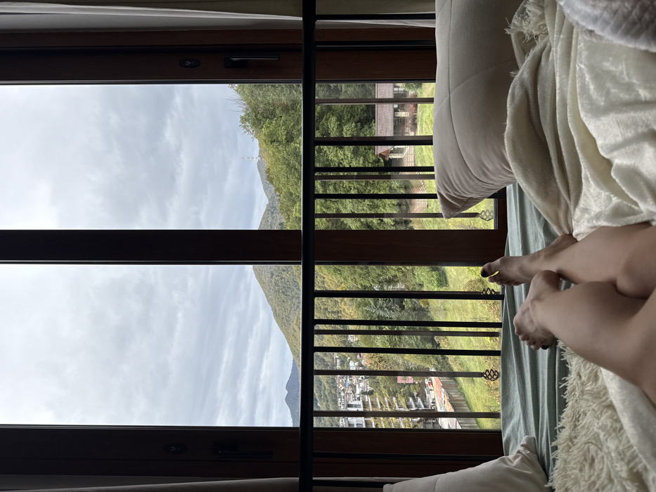 From an indoor, first-person perspective, the lower legs and feet of an individual are visible, resting on a bed covered with a light-colored, textured blanket and a pale green sheet