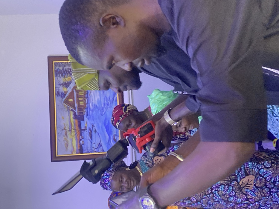 The scene is an indoor event located in Kwang, Nigeria, illuminated with a purple ambient light