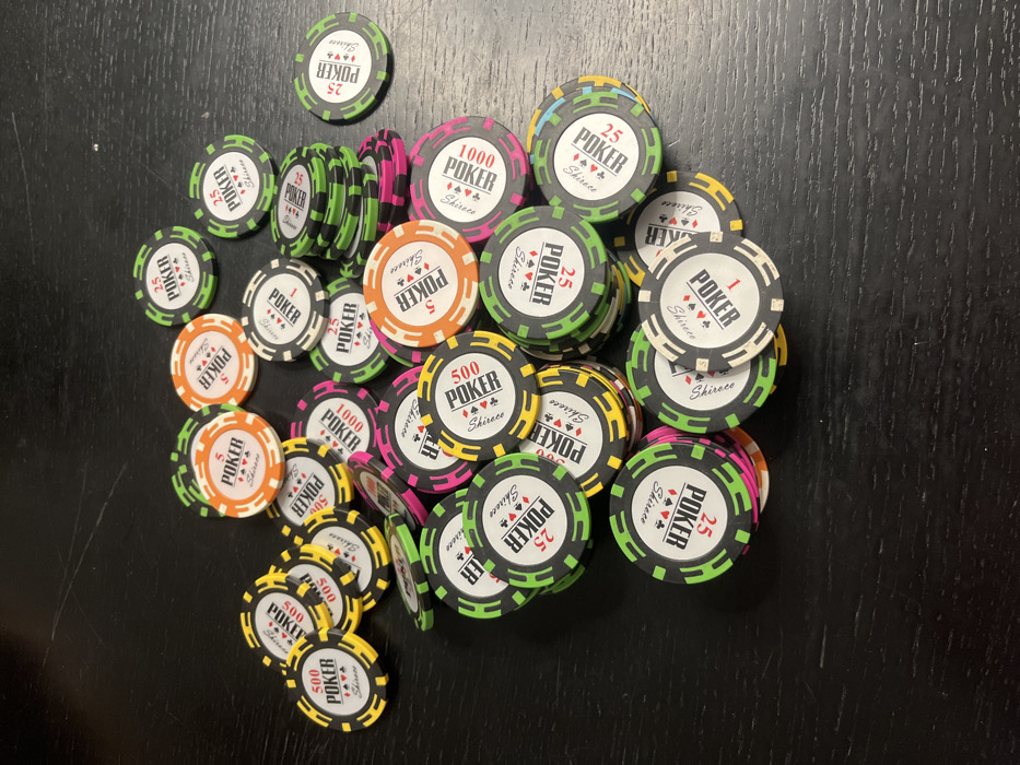 collection of poker chips scattered on a dark surface. The chips vary in denomination, indicated by numbers like 1, 5, 25, 500, and 1000. The chips are colored, featuring combinations of white, orange, yellow, green, and pink, and are labeled with the word "POKER" and a company name, "Shirece" or variations of it, along with card suits. The chips are arranged haphazardly, with some stacked while others are individual.