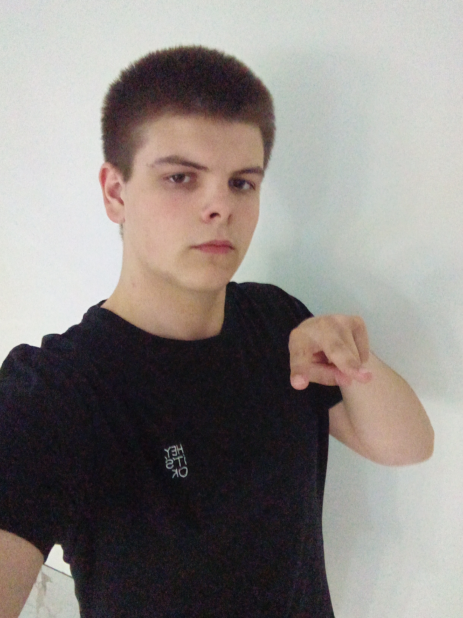 A young Caucasian male is positioned in front of a plain white wall, wearing a black t-shirt with reversed lettering on the chest. He is looking directly at the viewer with a neutral expression. His hair is short and dark. His right hand is raised and gesturing towards the viewer. The location is inferred to be Andreyevo, Russia.