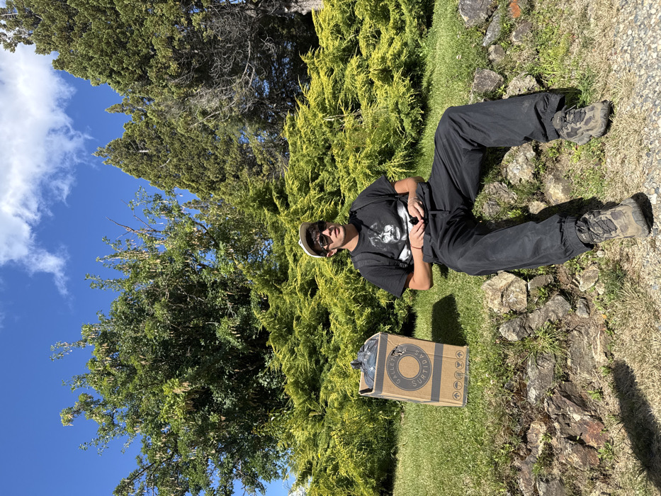 A person in black clothing, sunglasses, and a light-colored hat reclines on the grass next to a box labeled "Galletas Surtidas". The scene includes a bright blue sky and green trees in the background. The setting appears to be outdoors with a mixture of grass, foliage, and rocks. The image is rotated counter-clockwise.