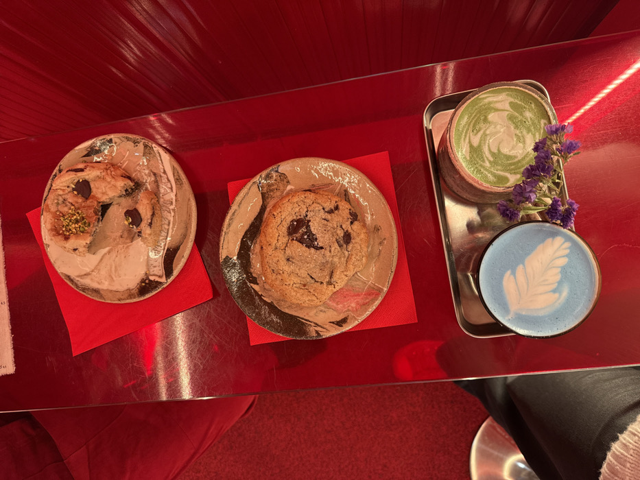 Two plates of cookies rest on red napkins on a red surface. The left plate contains broken cookies with pistachios, while the other contains a chocolate chip cookie. A tray to the right holds a green matcha latte and a light blue latte with a white leaf design, garnished with purple flowers. The table surface reflects light, adding to the vibrant red ambiance.