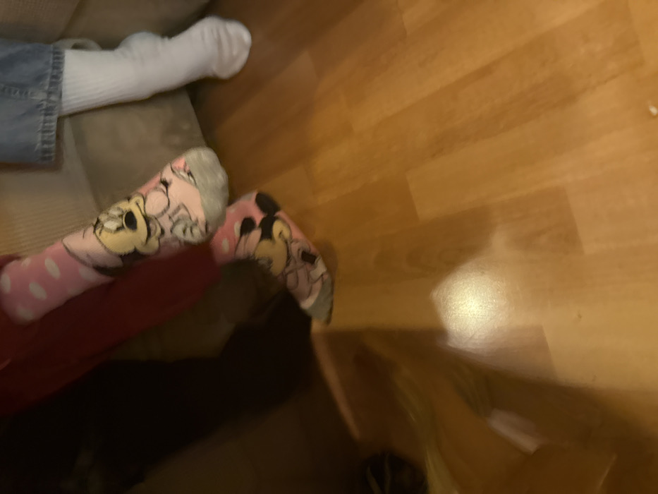 The image displays an indoor scene focused on the lower limbs of two individuals. In the foreground, a person wears red trousers and pink socks featuring white polka dots and a Minnie Mouse graphic, with gray accents on the toes and heels. These legs are positioned against a dark, undefined surface. Adjacent to this, a second individual's legs are visible, clothed in light blue denim jeans and plain white ribbed socks, positioned near a light-colored, upholstered surface. Both sets of legs are situated above a polished, light brown wood-laminate floor, which exhibits reflections from an ambient light source. No discernible actions or interactions between the individuals are visible, and the specific location within the city of Haskovo, Bulgaria, cannot be determined from the visual information provided.
