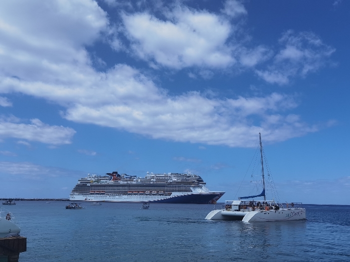 The scene is a waterfront in Cozumel, Mexico, located at 20.512 latitude, -86.95 longitude. A large cruise ship is docked at the pier, its hull painted in white and blue with a large red logo. A white catamaran is sailing past the cruise ship, its white sails are fully extended, and it is marked "Jolly Roger" on the stern. The water is calm and blue, and there are a few small boats in the distance. The sky is blue and clear with a few white clouds. Several people are visible on the catamaran, and they appear to be enjoying the sunshine and the view. The scene is peaceful and serene.